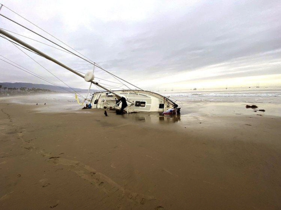 Boat #3 (pictured above) washed ashore during Tuesday’s storm and ran aground below the Santa Barbara cemetery 50 feet inside the Santa Barbara County line. Carson Chevitz, Owner of TowBoatUS Ventura, is working to get the boat off the beach, but as of this writing, the vessel is still there – and there isn’t much time before it starts to tear apart in the surf.