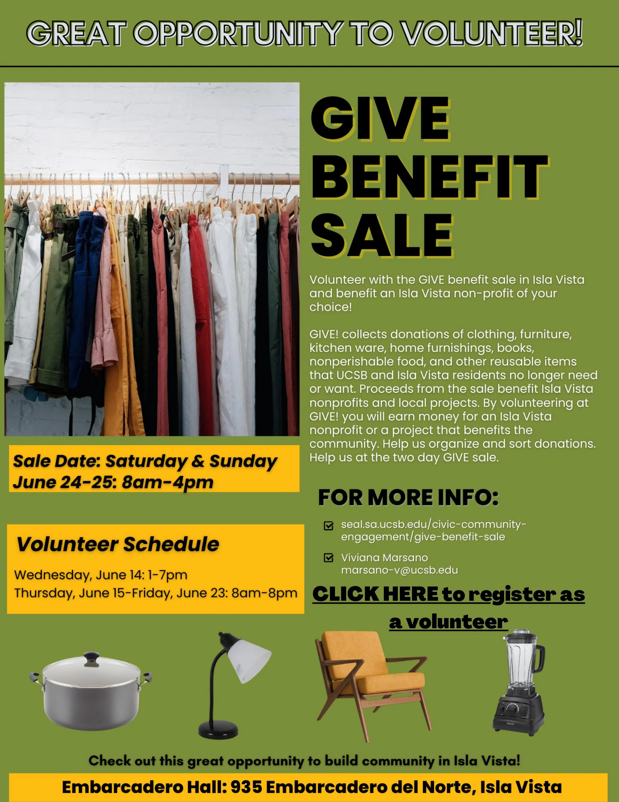 To remedy this problem - and turn this lemon into lemonade - the Isla Vista CSD organizes its annual Give Benefit Sale. During this event, items are collected from UCSB dorms and the streets of Isla Vista. After undergoing thorough sorting and organization, these items are made available for sale back to the community. This approach not only reduces waste but also significantly promotes reuse, resulting in numerous attractive deals for everyone involved.