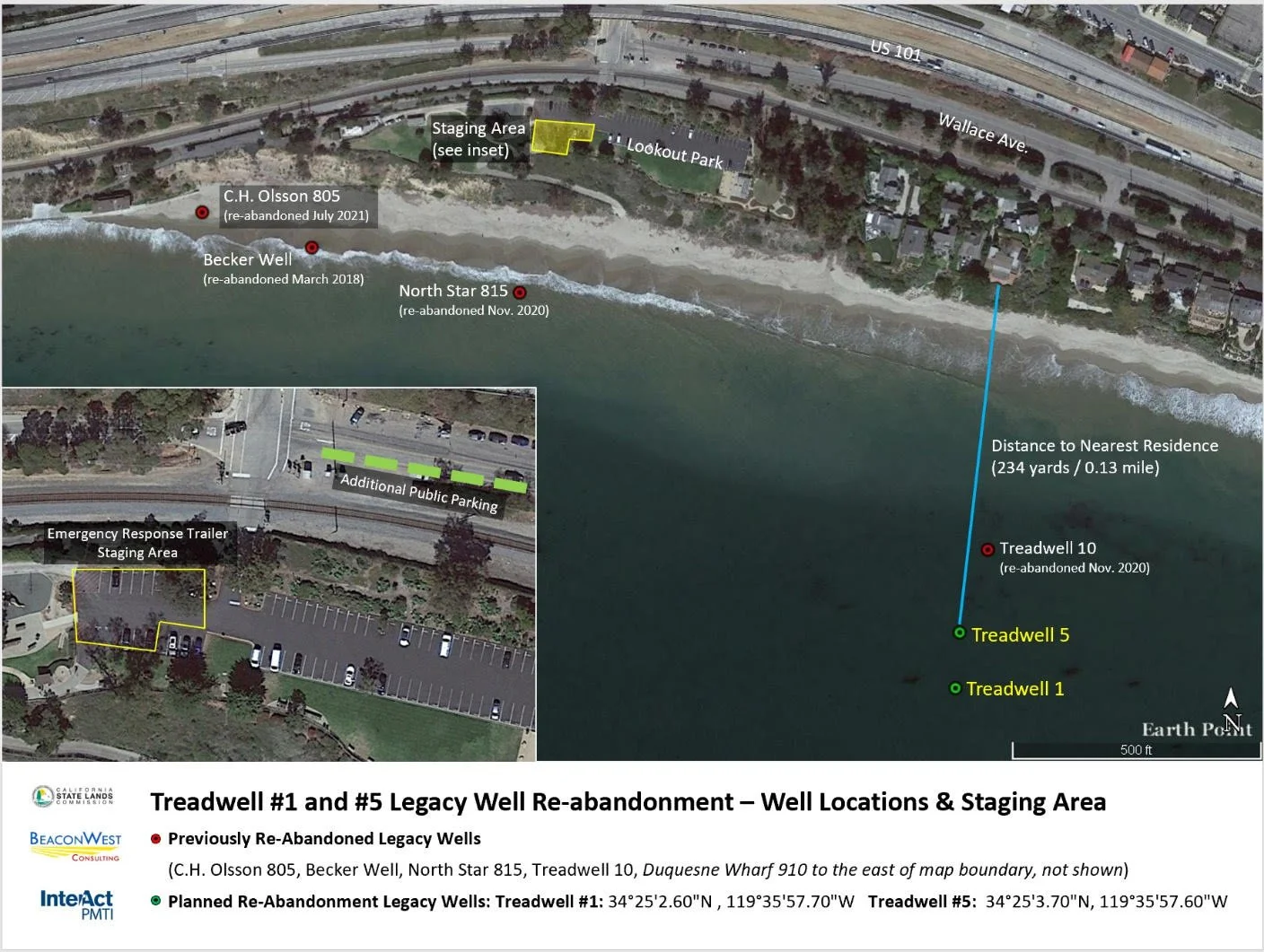 On behalf of the California State Lands Commission, 2H, and the entire Legacy Well Re-Abandonment team, this is to inform you of the schedule for the next phase of work under this program. The Curtin Maritime barge is scheduled to mobilize from Long Beach on August 13 and arrive onsite, offshore Summerland, the morning of Monday, August 14, 2023, to set anchors and begin well abandonment activities. Re-abandonment of legacy wells Treadwell #1 and #5 is expected to take 5-6 days per well (see well locations noted in Yellow below). Notices are being posted this week at nearby locations (Lookout Park, Loon Point, Wallace Ave) and in the Santa Barbara Independent. A portion of Lookout Park parking lot will be used for emergency response equipment as a contingency measure (see inset).